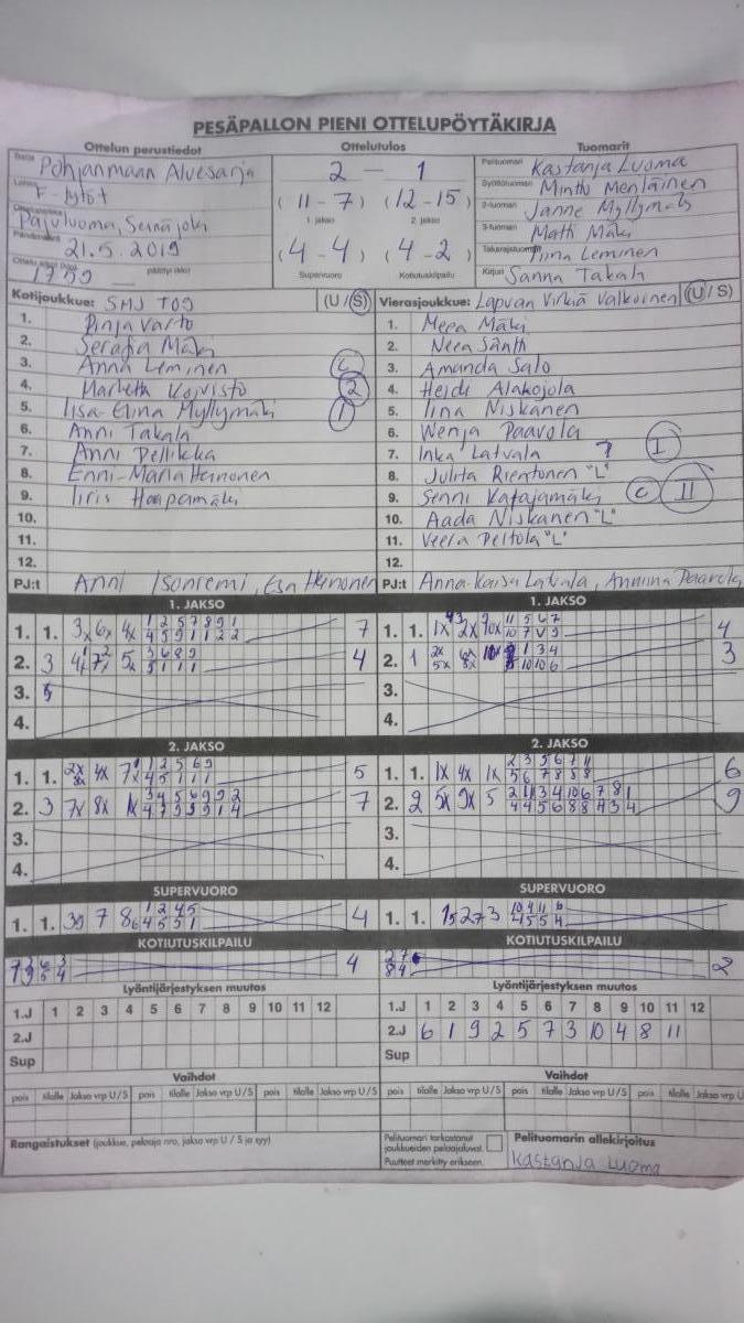 | 21.5.2019 18:00 | SMJ T09 | Virkiä Valkoinen | 2-1 (11-7, 12-15, 4-4, 4-2) | näytä | |
