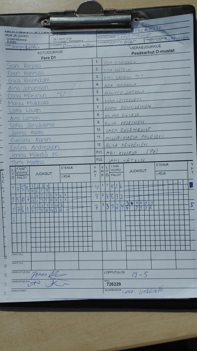 | D-tytöt kilpasarja - B-lohko | 18.7.2019 15:00 | T11 Lintula1, Parkkipaikka | KaKa | Fera D1 | Pesäkarhut D-mustat |