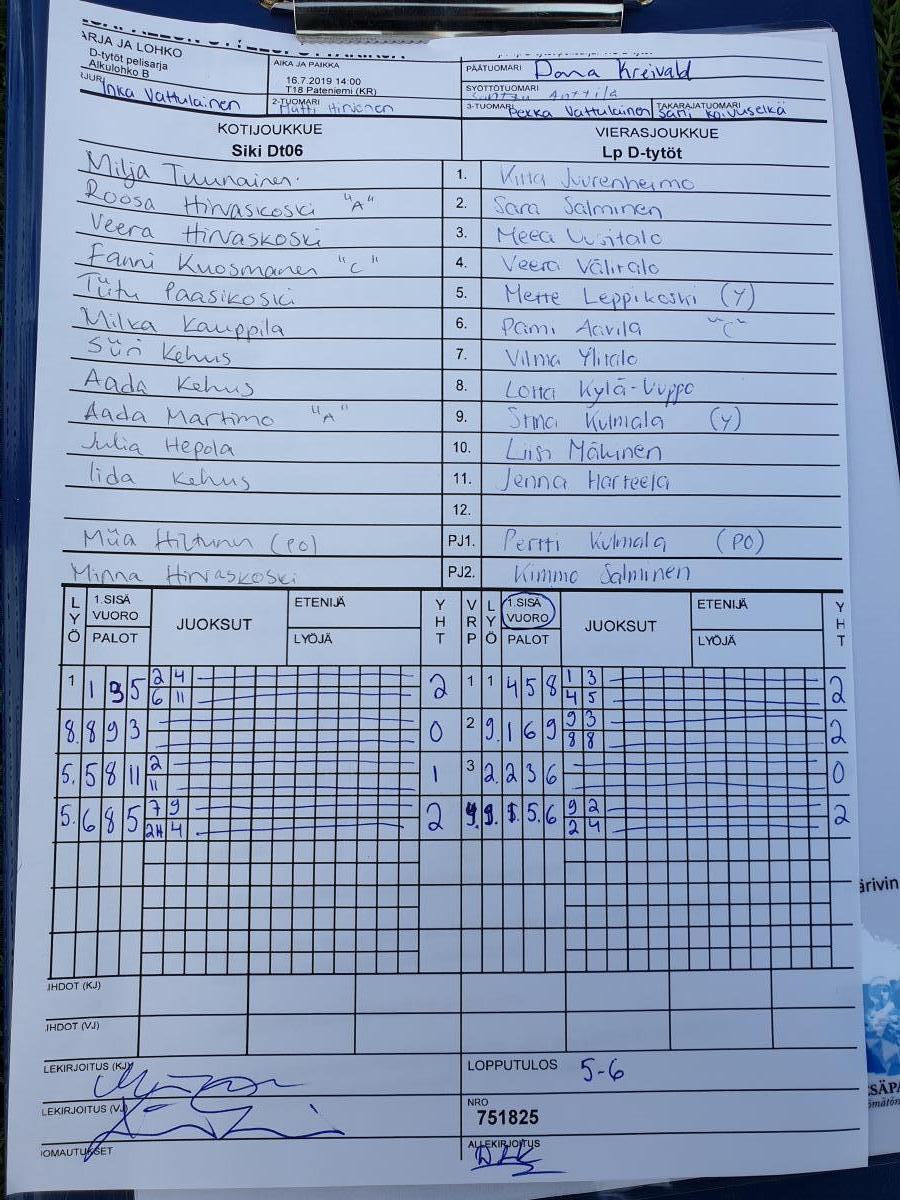 | 16.7.2019 14:00 | T18 Pateniemi (KR) | Siki Dt06 | Lp D-tytöt | 5-6 | näytä |