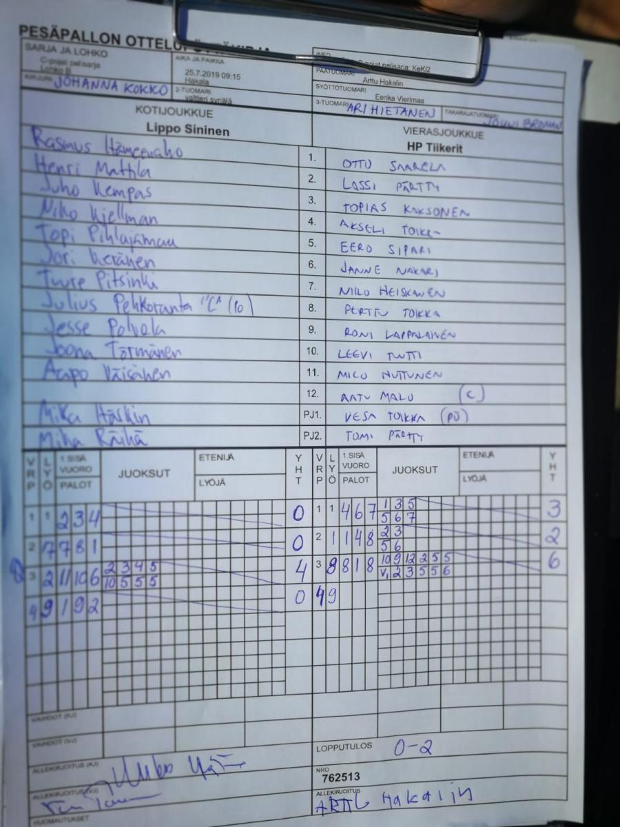 | C-pojat pelisarja - Lohko J | 25.7.2019 14:15 | Hakala | Manse PP Cp2 | HP | Lippo Sininen |
