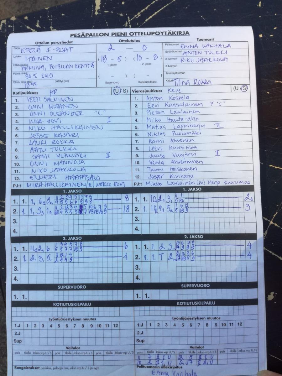 | 28.7.2019 18:00 | Hamina | ViPa F | HP F-pojat | 0-2 (6-7, 3-12) | |