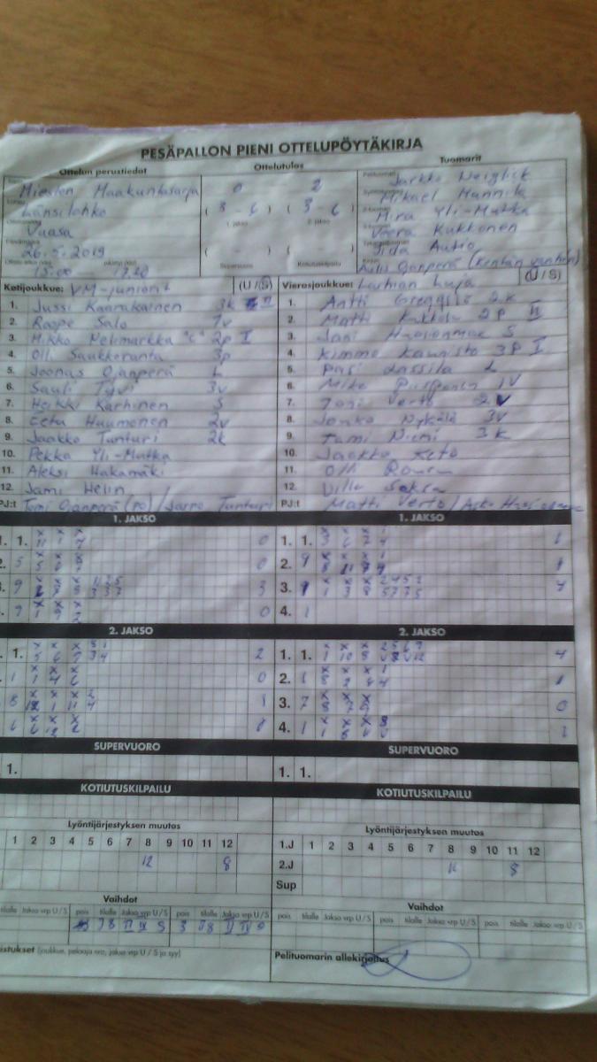 | 16.6.2019 15:00 | Vaasan Maila | Ylihärmän Pesis-Junkkarit | 0-2 (3-21, 0-6) | näytä | |