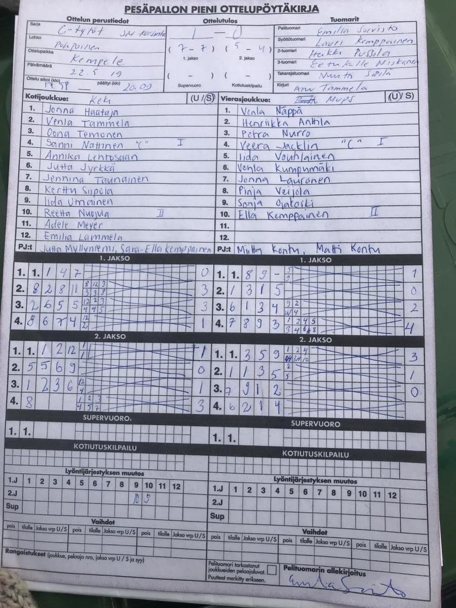 | 24.6.2019 18:00 | Muhoksen Pallo-Salamat | Kempeleen Kiri | 2-0 (9-3, 13-2) | näytä |