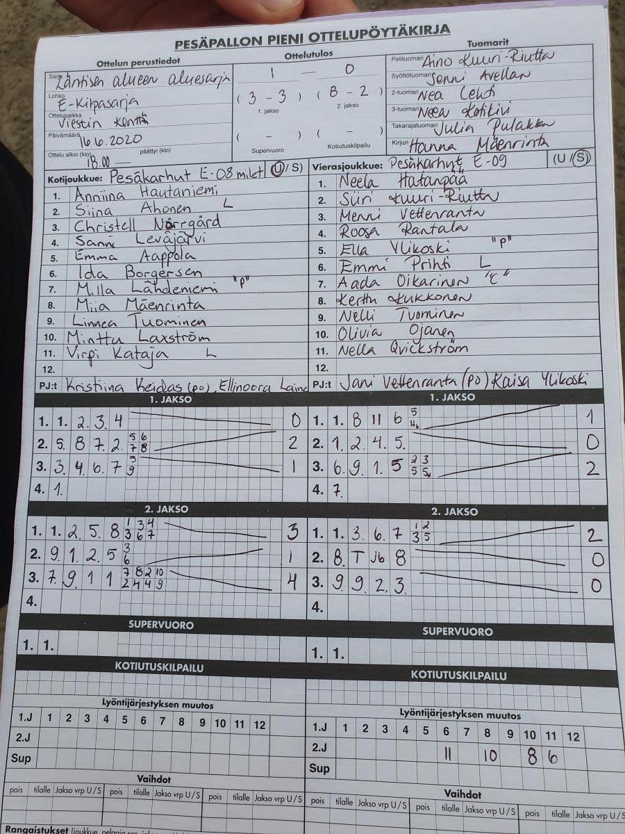 | 4.8.2020 18:00 | Pesäkarhut E09-tytöt | Pesäkarhut E-Milet | 0-2 (0-9, 6-7) | näytä | |