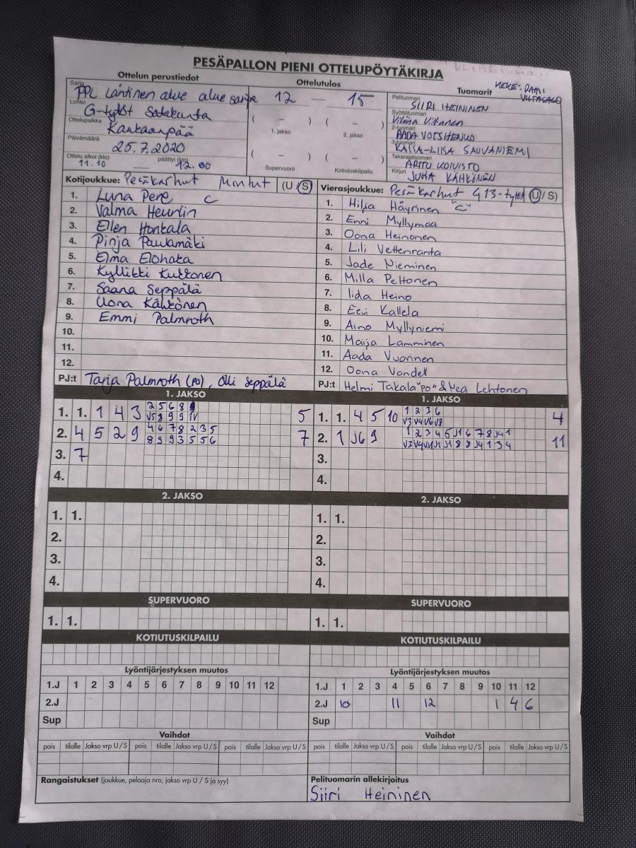 | 25.7.2020 11:00 | Pesäkarhut Mintut | Pesäkarhut G13 -tytöt | 12-15 | näytä | |