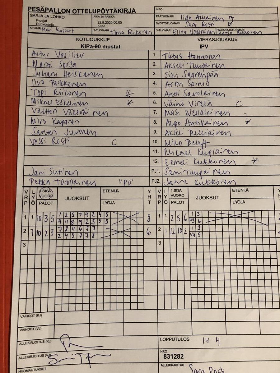 | 8.8.2020 00:02 | Kitee | KiPa-90 mustat | IPV | 29-5 | näytä |