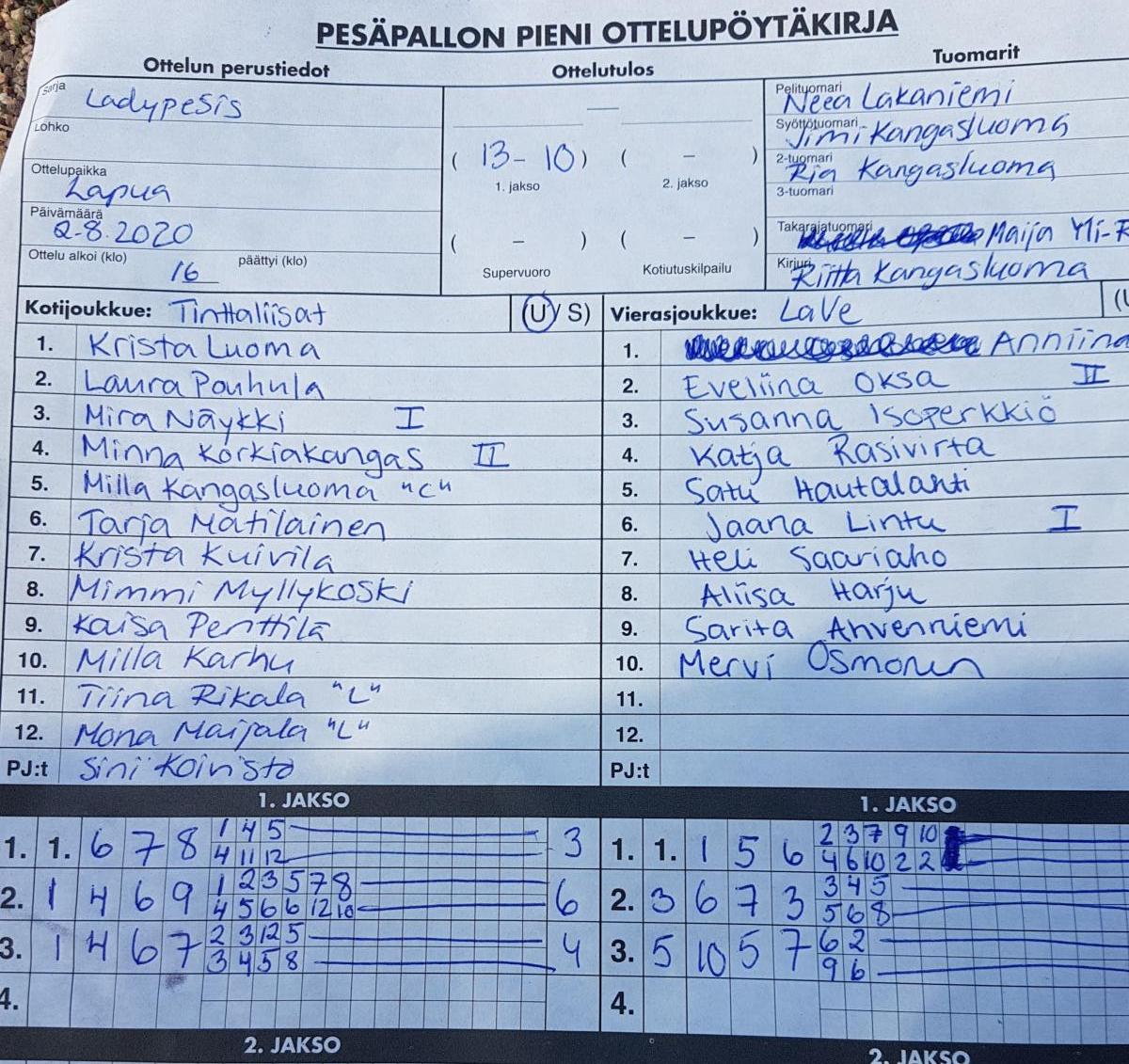 | 7.7.2020 19:00 | Tinttaliisat Musta | Virkiä Ladyt | 9-8 | näytä | |