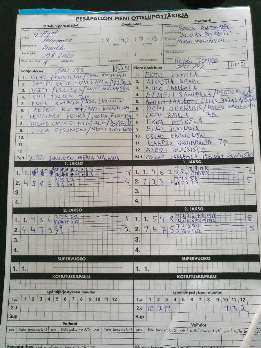 | 2.8.2020 13:00 | SMJ P13 | AA | 2-1 (6-8, 17-4, 4-4, 5-4) | näytä | |