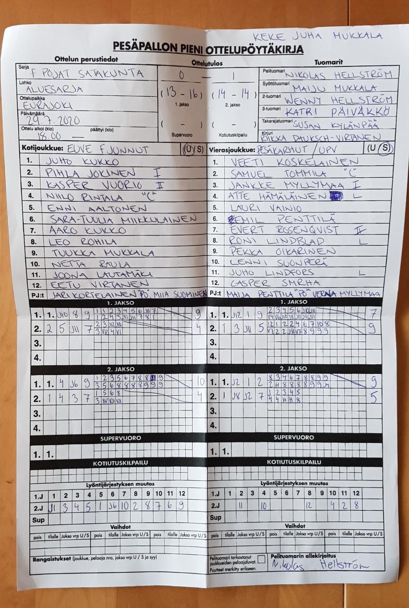 | 29.7.2020 18:00 | EuVe F-junnut | Pesäkarhut/UPV | 0-1 (13-16, 14-14) | näytä | |
