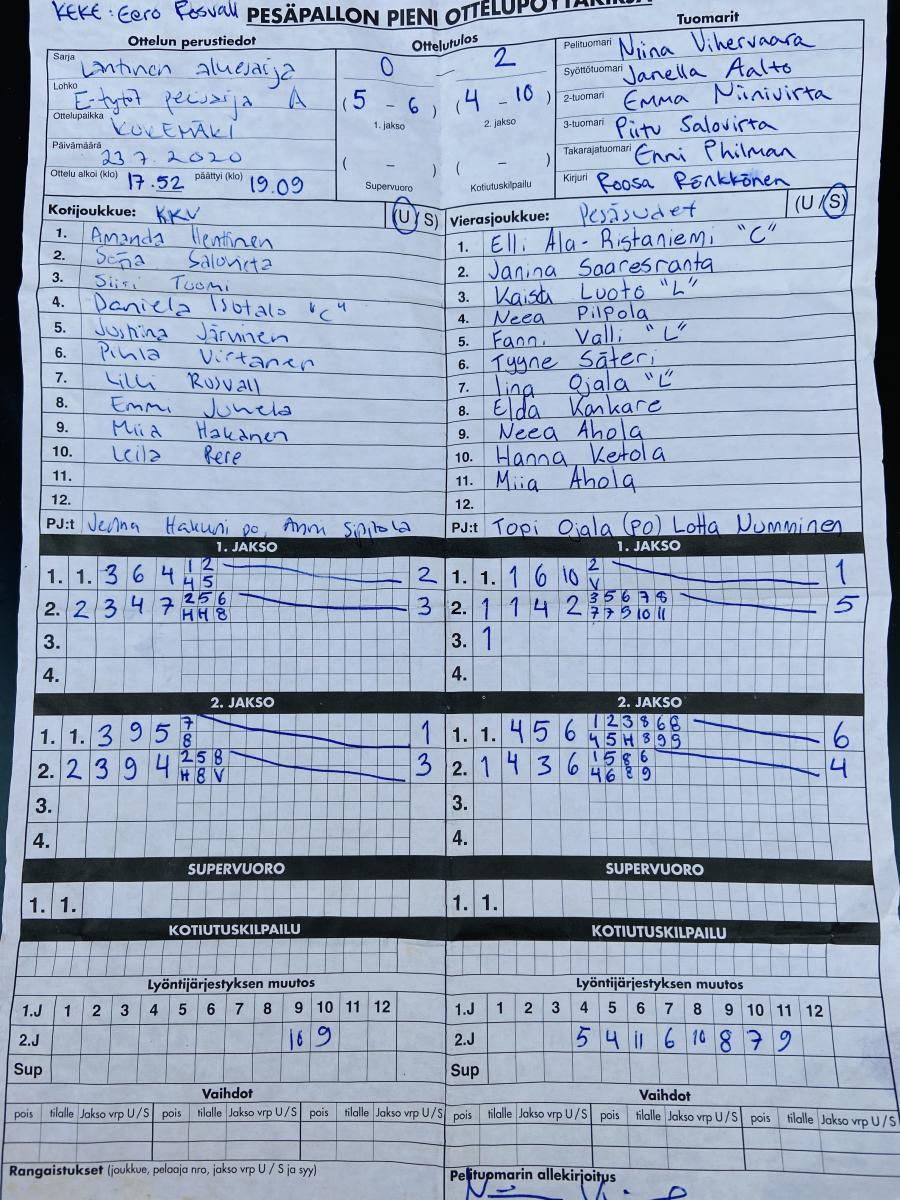 | 23.7.2020 18:00 | KK-V E-tytöt | Pesäsudet E08 | 0-2 (5-6, 4-10) | näytä | |