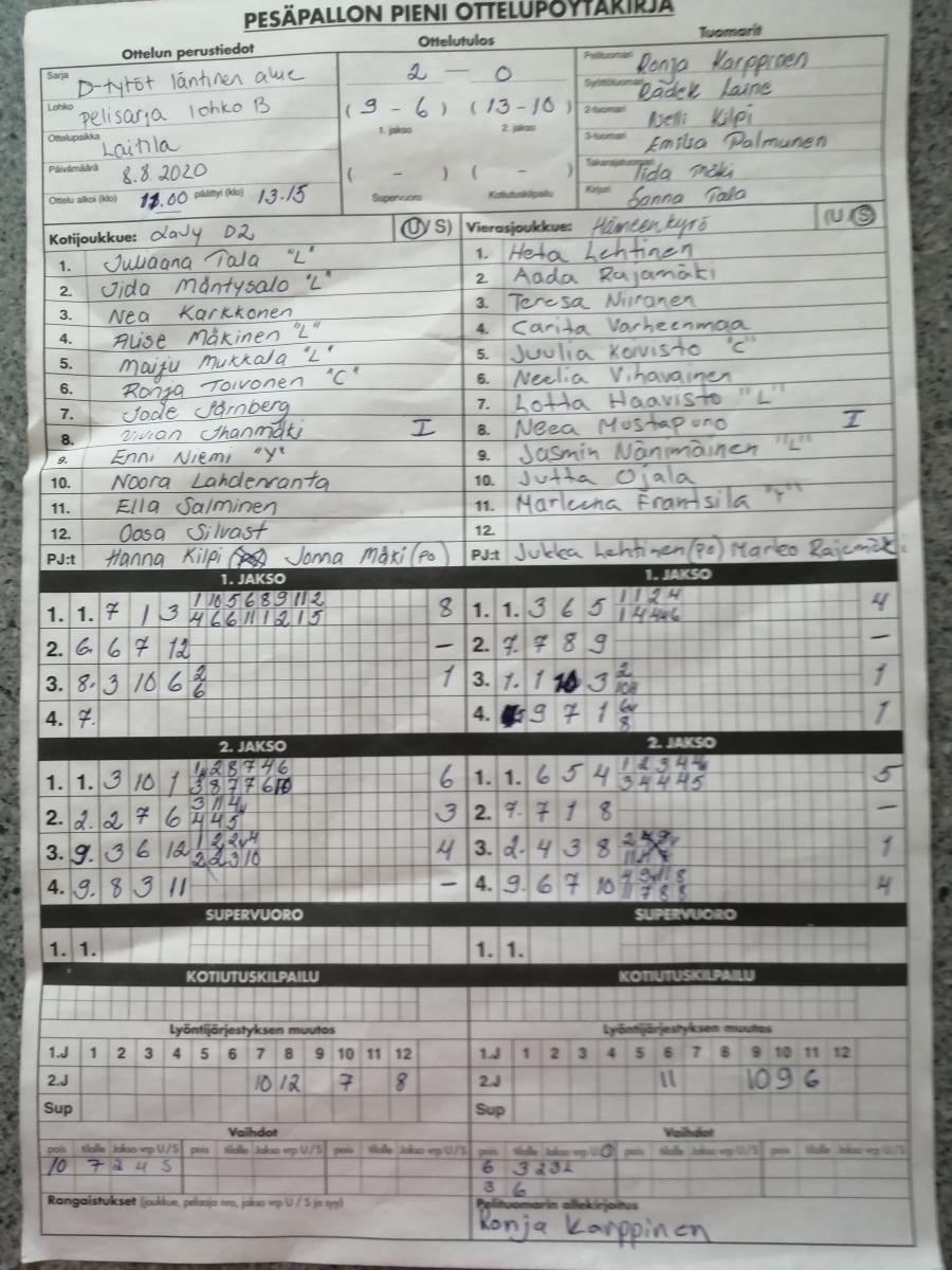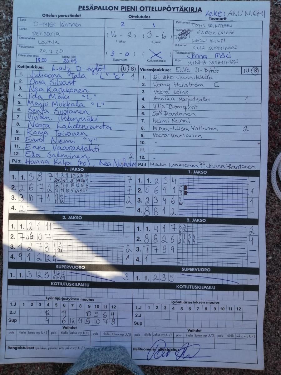 | 20.7.2020 18:00 | LaJy D2 | EuVe D-tytöt | 2-1 (16-2, 3-6, 3-0) | näytä | |