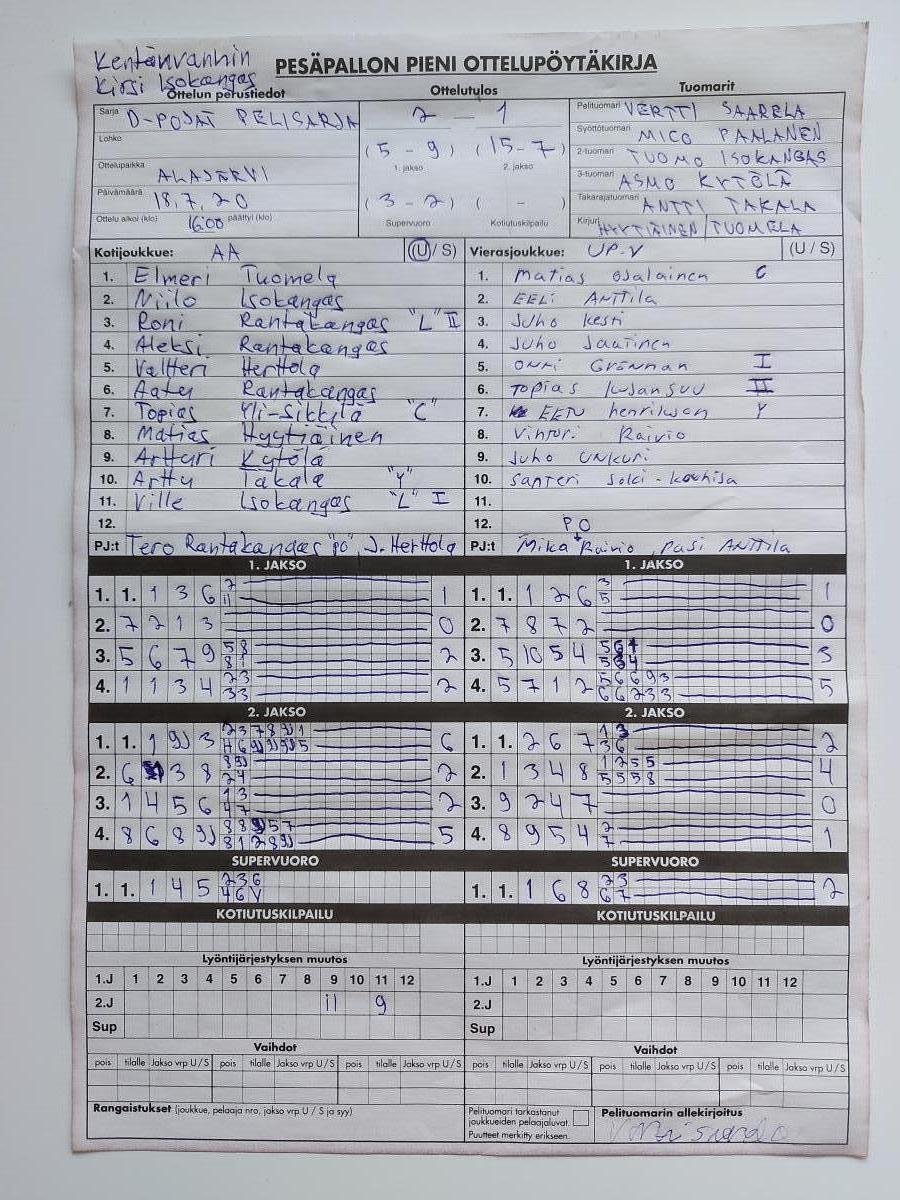 | 18.7.2020 16:00 | AA-07 | UPV D-Pojat | 2-1 (5-9, 15-7, 3-2) | näytä | |