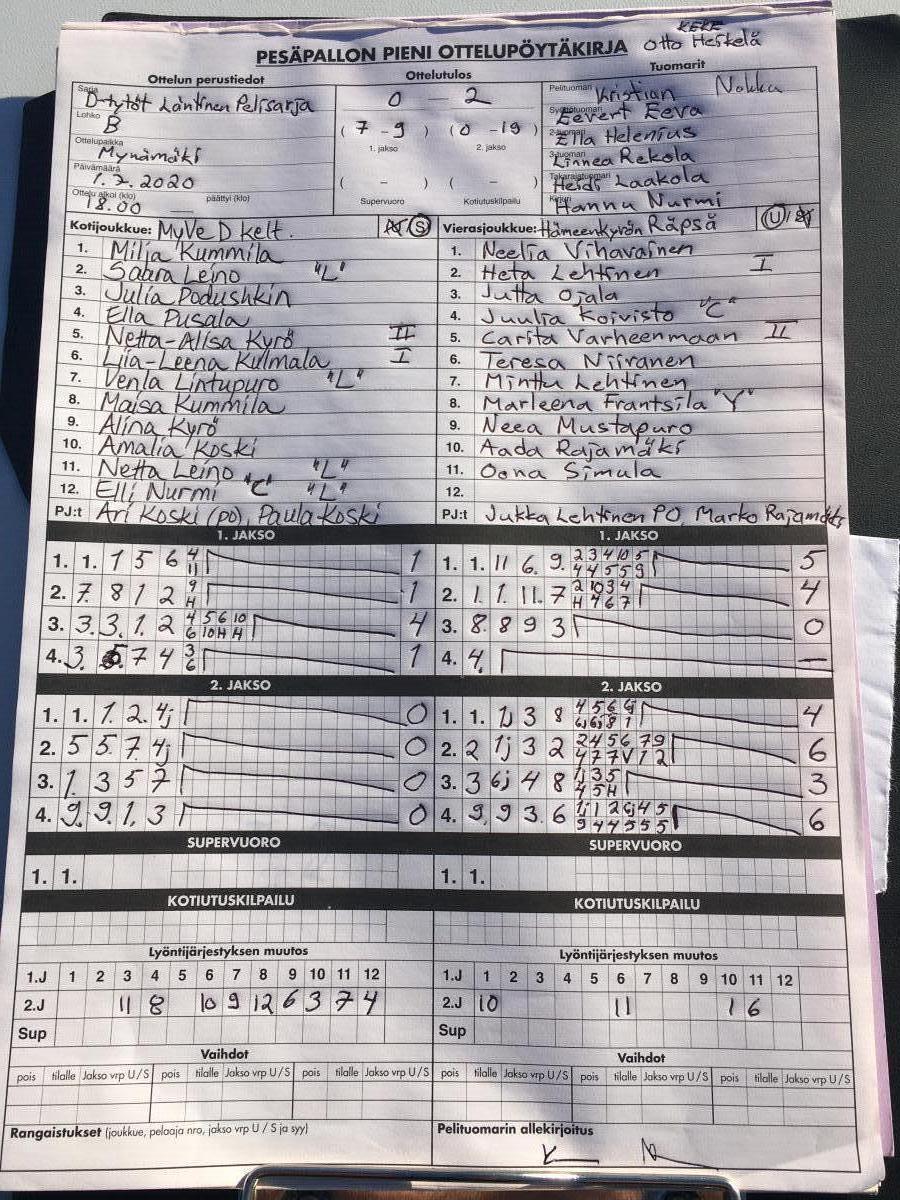 | 1.7.2020 18:00 | MyVe D-keltaiset | Räpsä D-tytöt | 0-2 (7-9, 0-19) | näytä | |