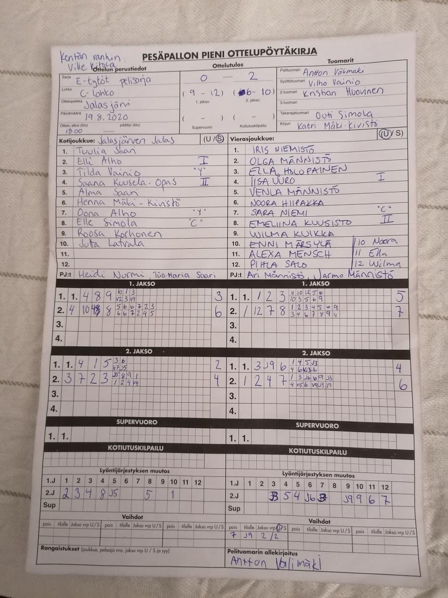 | 5.8.2020 18:30 | VM E-t oranssi | KoU E-Punainen | 1-2 (2-11, 8-6, 1-2) | näytä | |