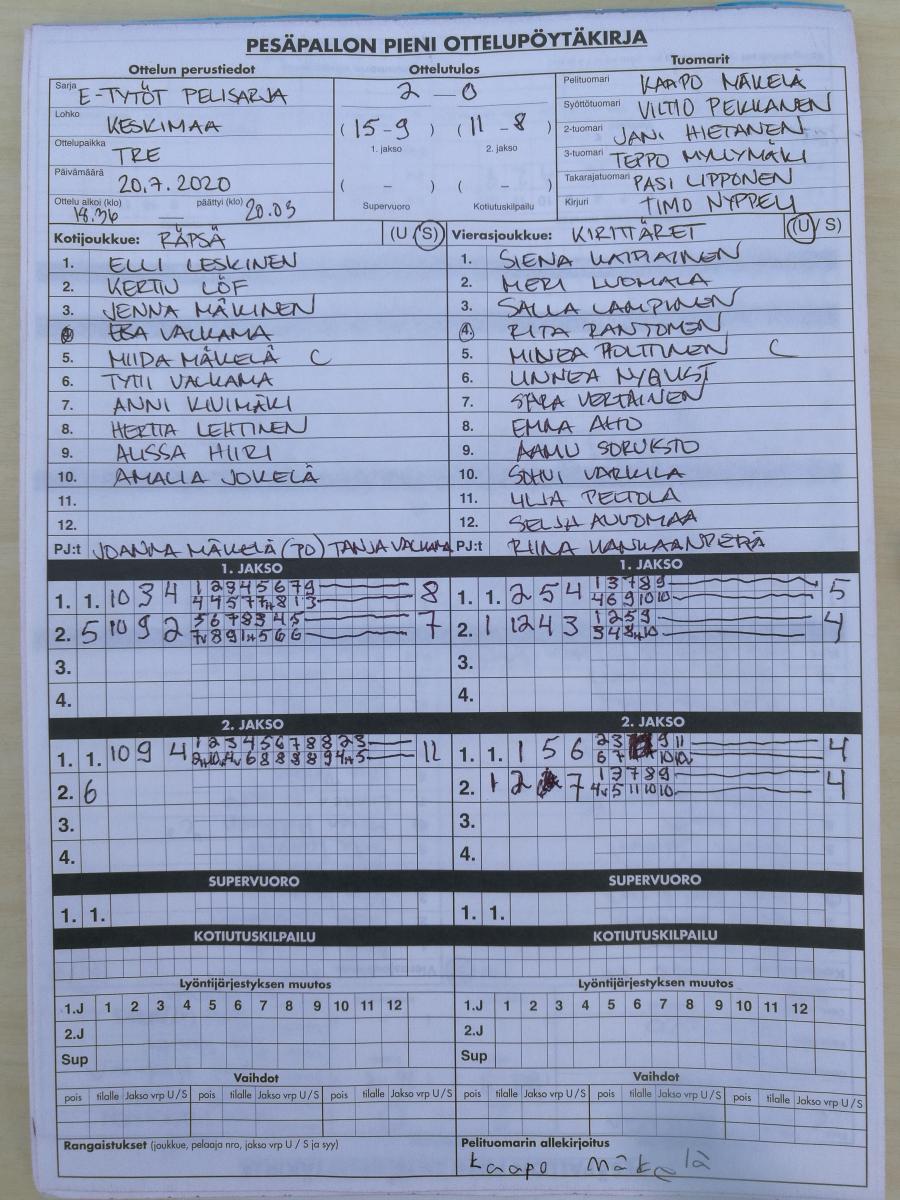 | 20.7.2020 16:30 | Manse PP E-tytöt | Kirittäret E-Tytöt | 2-0 (29-9, 16-8) | näytä | |