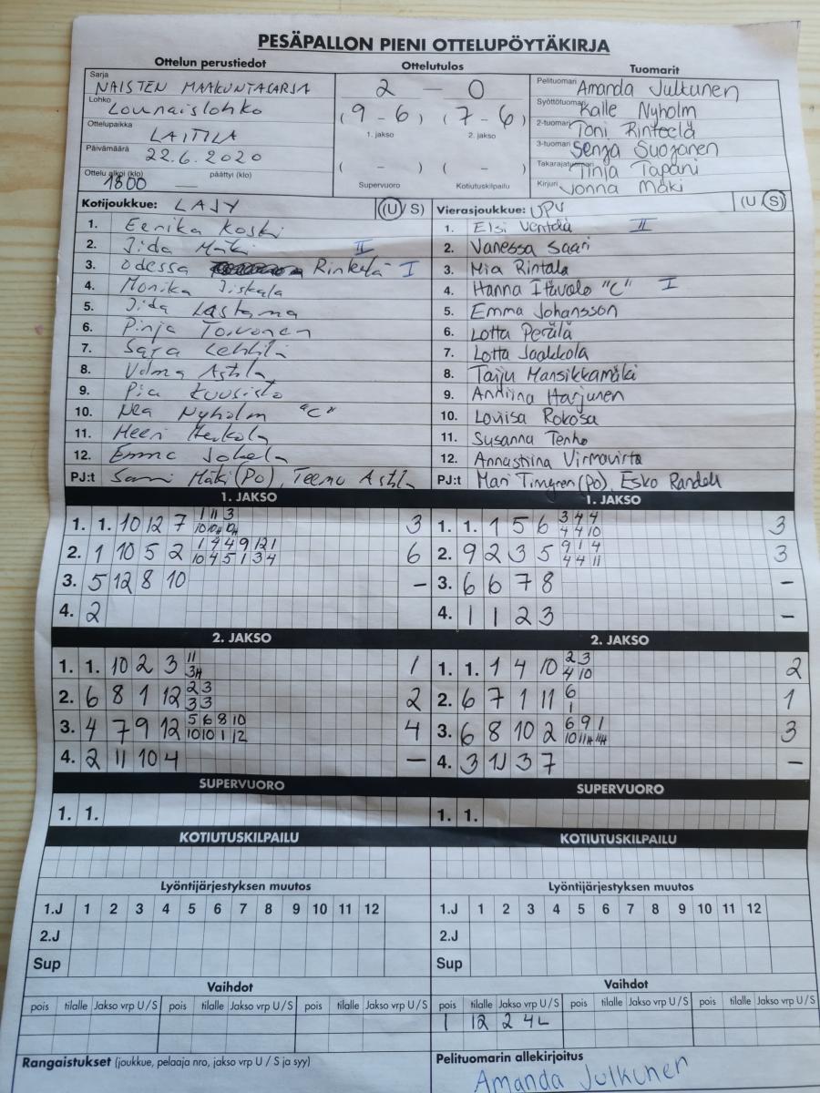 | 22.6.2020 18:00 | Laitilan Jyske | Ulvilan Pesä-Veikot | 2-0 (9-6, 7-6) | näytä | |