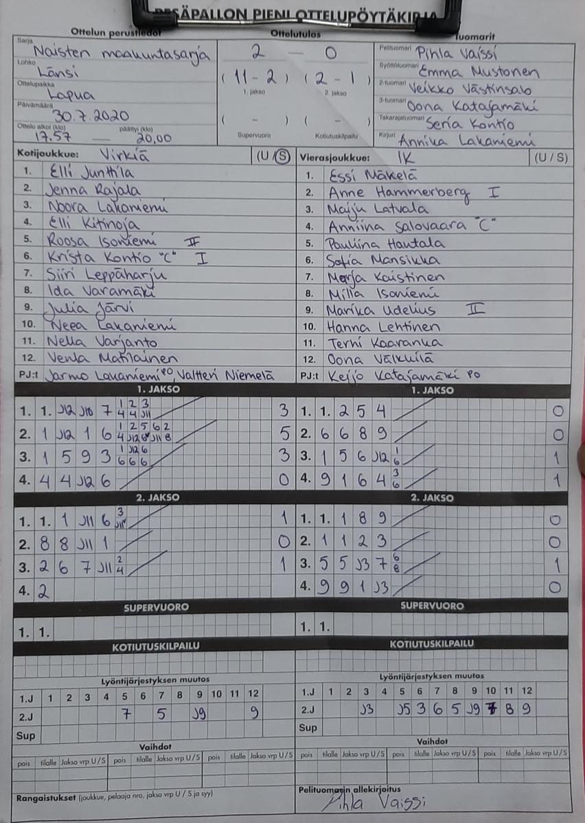| 22.8.2020 14:00 | Virkiä3 | VäVi | 2-0 (12-6, 20-2) | näytä | |