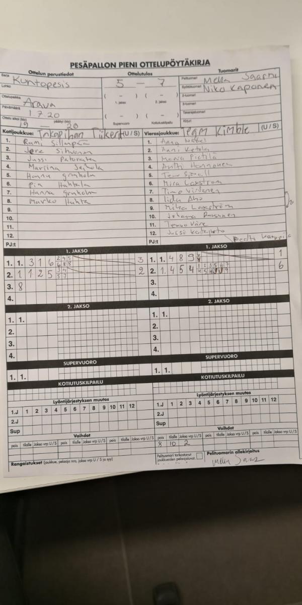 | Kuntopesissarja - Supersarja | 17.7.2020 18:00 | Arava | Team Luvata | Pesäetanat | Takapihan Tiikerit |