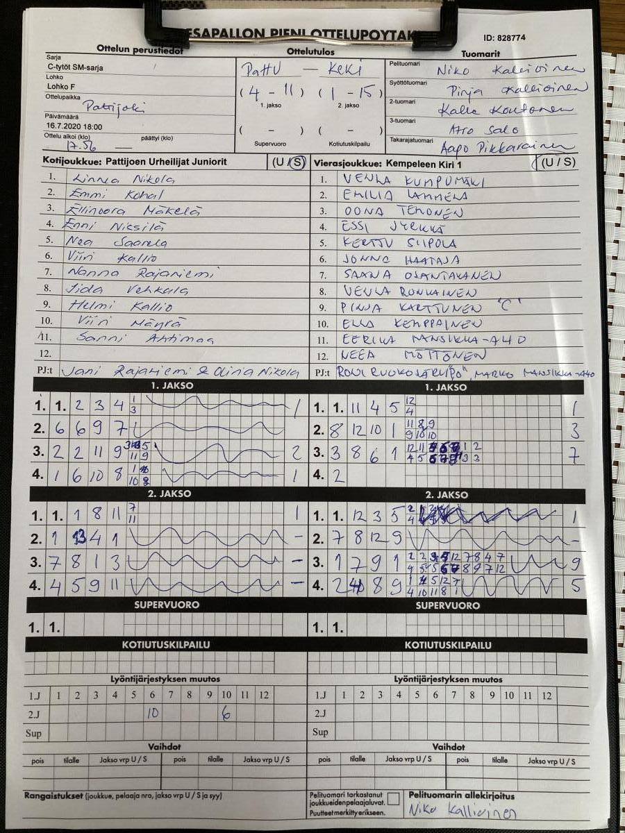 | 16.7.2020 18:00 | Pattijoen Urheilijat Juniorit | Kempeleen Kiri 1 | 0-2 (4-11, 1-15) | näytä | |