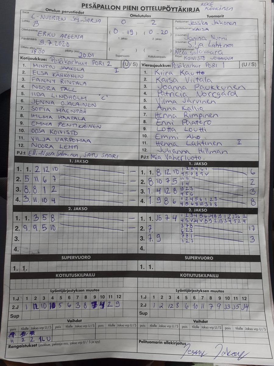 | 9.7.2020 18:00 | Pesäkarhut C-mustat, Pori | Pesäkarhut, Pori | 0-2 (0-19, 0-20) | näytä | |