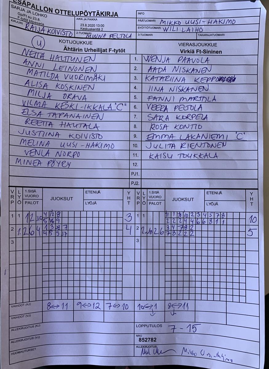 | 23.8.2020 14:00 | Keskuskenttä 2 | Ähtärin Urheilijat F-tytöt | Virkiä Ft-Sininen | 7-15 | näytä |