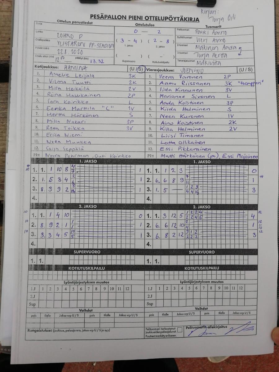 | 23.8.2020 14:00 | Skaala Areena | Joensuun Maila | Pesäkarhut, Pori | 0-2 (0-15, 6-12) | näytä |