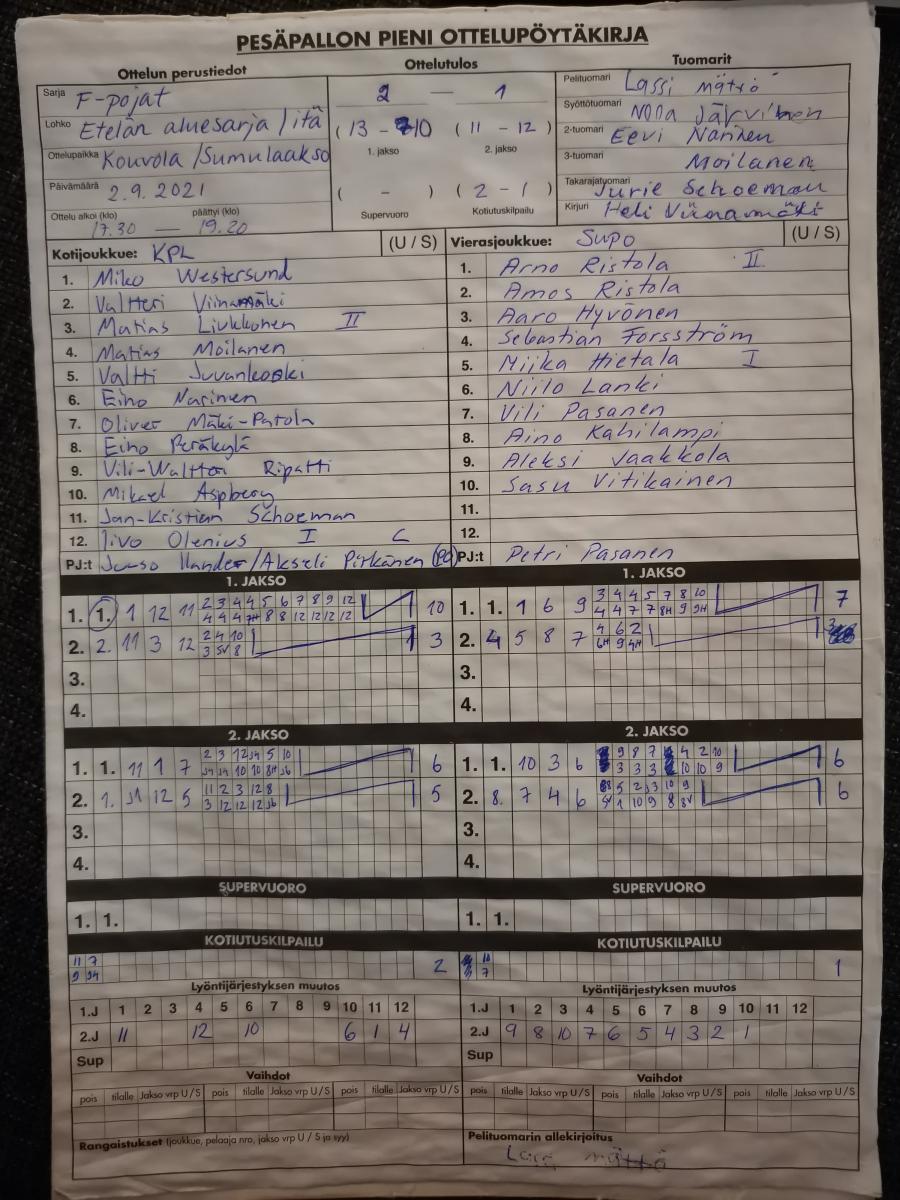 | 19.6.2021 18:00 | Kouvola | SuPo F-Pojat | KPL F | 0-1 (9-19, 0-0) | näytä |
