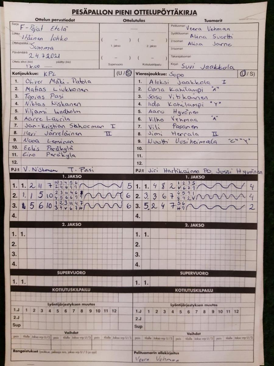 | 24.7.2021 12:00 | Summa | KPL F | SuPo F-Pojat | 1-0 (17-10, 0-0) | näytä |