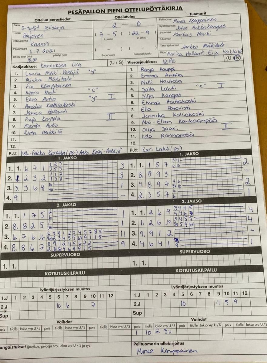 | 6.7.2021 | Kannuksen Ura D-tytöt | VePe | 2-0 (7-5, 22-9) | näytä | |