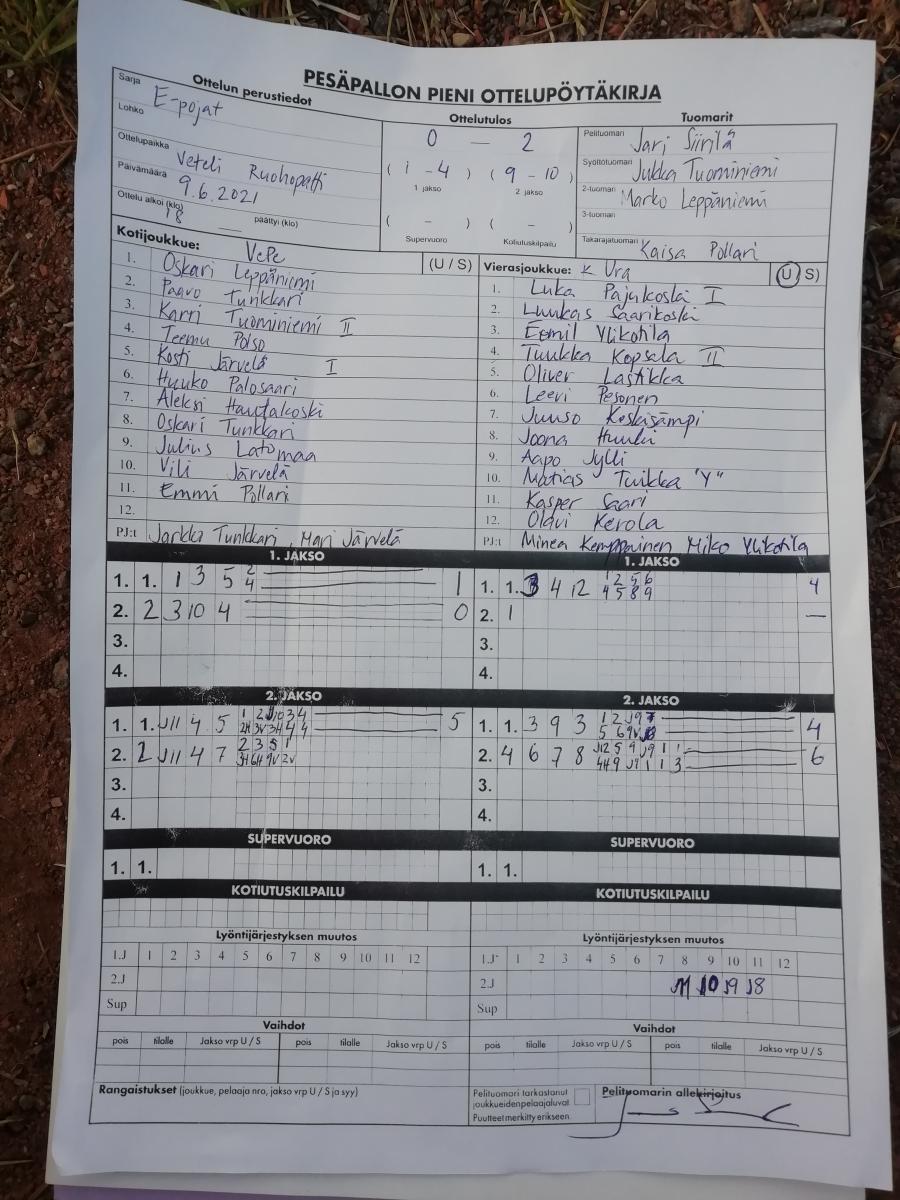| 9.6.2021 | VePe | Kannuksen Ura E-pojat | 0-2 (1-4, 9-10) | näytä | |