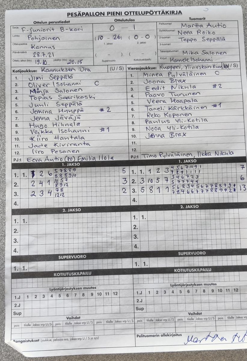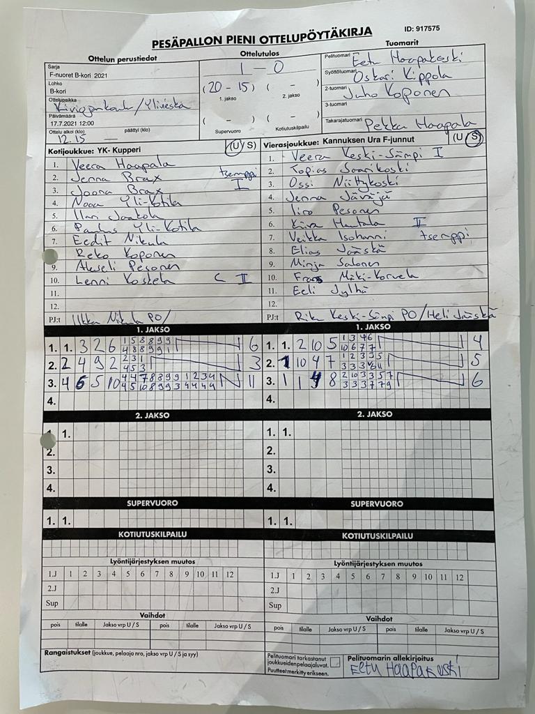 | 17.7.2021 | YK- Kupperi | Kannuksen Ura F-junnut | 1-0 (20-15, 0-0) | näytä | |