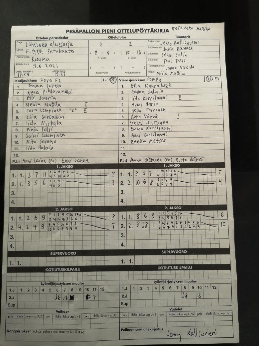 | 9.6.2021 18:00 | Fera F2 | PomPy F-Junnut | 0-2 (8-9, 15-16) | näytä | |
