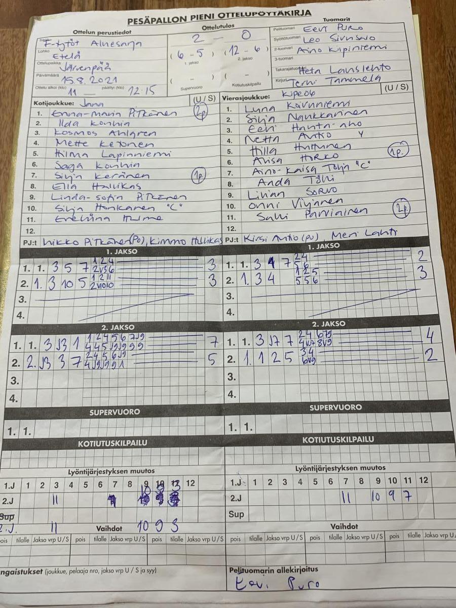 | 15.8.2021 16:00 | Kerava | Jana FT | KePe | 2-0 (10-5, 9-6) | näytä |