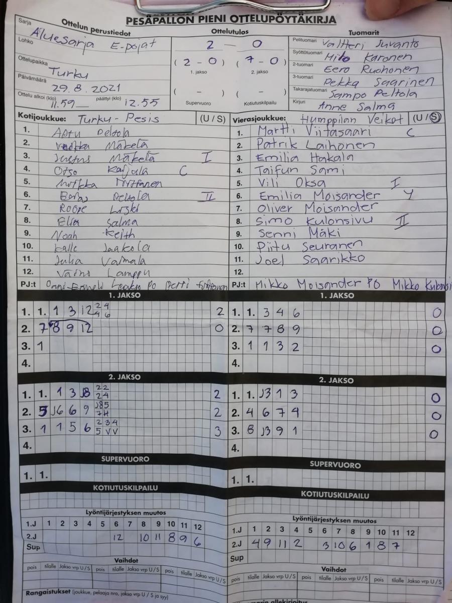 | 29.8.2021 00:00 | Turku Pesis EP | HuVe E-pojat | 2-0 (34-3, 12-2) | näytä |