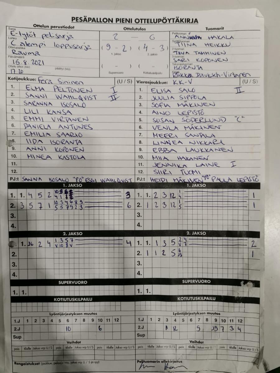 | 15.8.2021 17:00 | Fera Sininen | KK-V | 2-0 (9-2, 4-3) | näytä | |