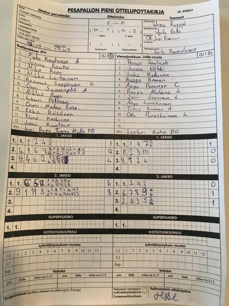 | 5.9.2021 14:00 | Sotkamo | JoMa punainen | JoMa musta | 2-1 (12-1, 4-8, 0-0, 3-1) | näytä |