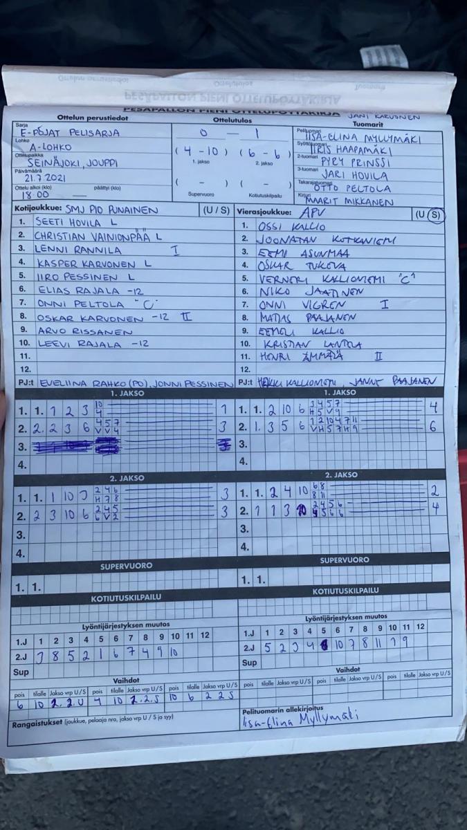| 8.7.2021 18:00 | APV | SMJ E10 punainen | 2-0 (13-6, 8-6) | näytä | |