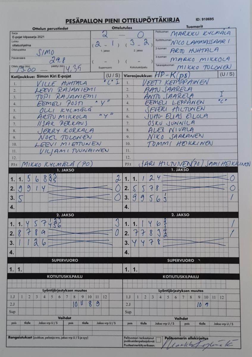 | 3.7.2021 | HP-K | Simon Kiri E-pojat | 2-0 (3-2, 7-4) | ||