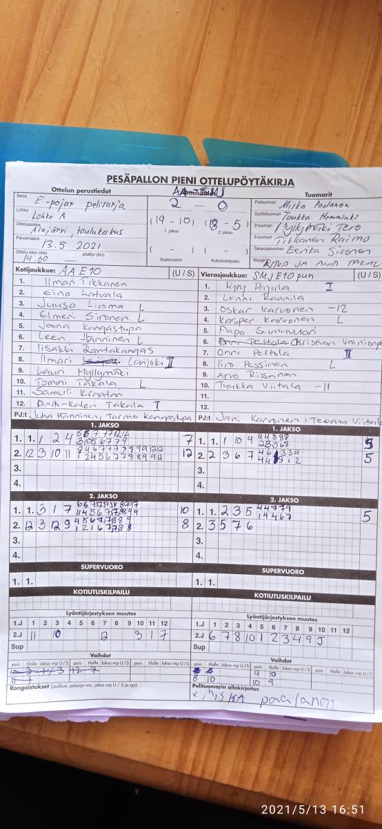 | 13.5.2021 14:00 | AA 10 | SMJ E10 punainen | 2-0 (19-10, 18-5) | näytä | |