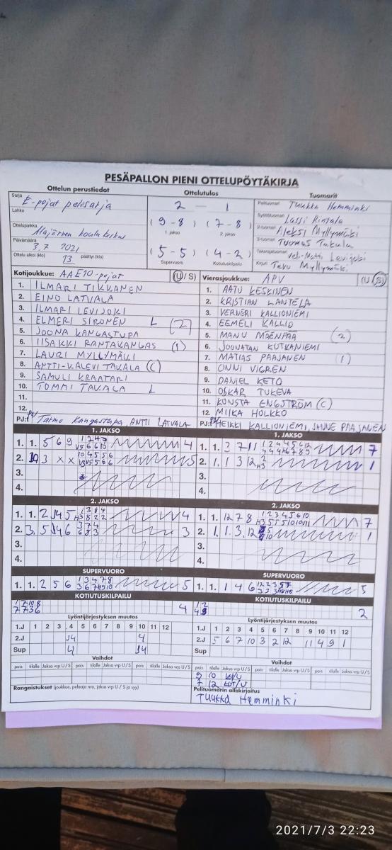 | 15.6.2021 18:00 | ÄhtU E-pojat | AA 10 | 2-0 (11-8, 11-9) | näytä | |