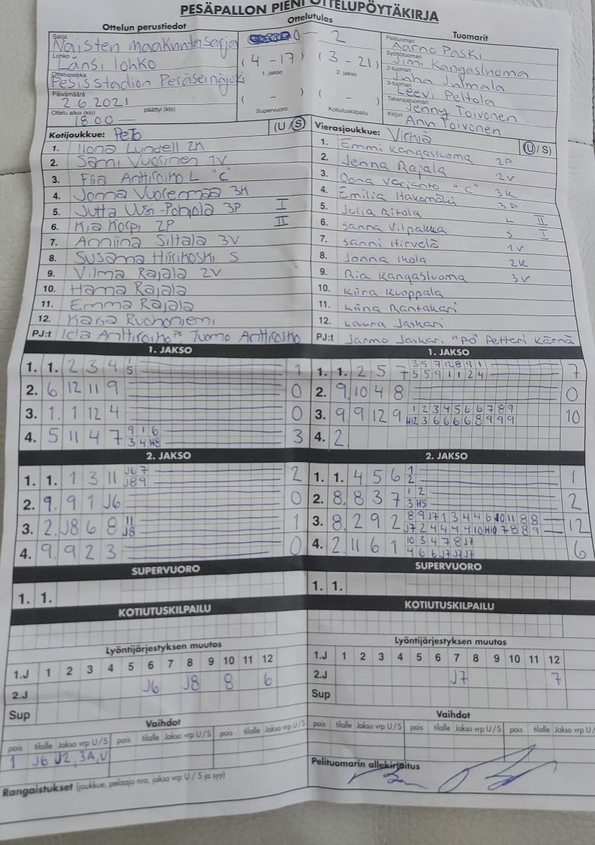 | 23.6.2021 18:00 | PeTo | VäVi | 0-2 (8-9, 2-3) | näytä | |