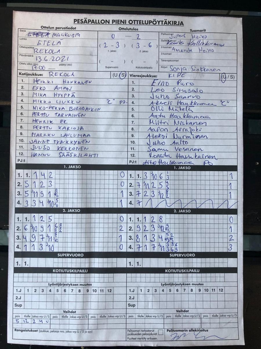 | 22.6.2021 | Rekolan Pesis | Cobra Team | 1-2 (4-5, 2-1, 3-5) | näytä | |