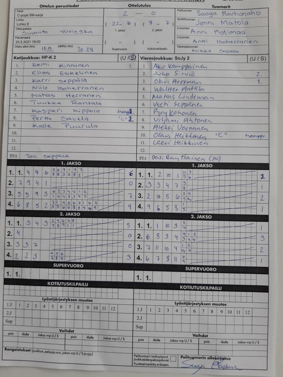 | 20.5.2021 18:00 | HP-K 2 | SoJy 2 | 2-0 (22-6, 8-7) | näytä | |