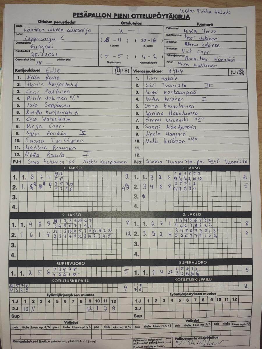 | 28.7.2021 18:00 | EuVe Ft | JYMY F TYTÖT | 2-1 (6-11, 20-16, 5-5, 4-2) | näytä | |