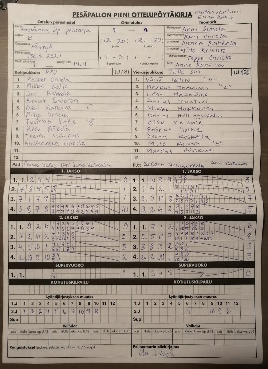 | 30.5.2021 00:00 | PöU Dp | TuPe sininen | 2-1 (12-20, 21-20, 1-0) | näytä | |