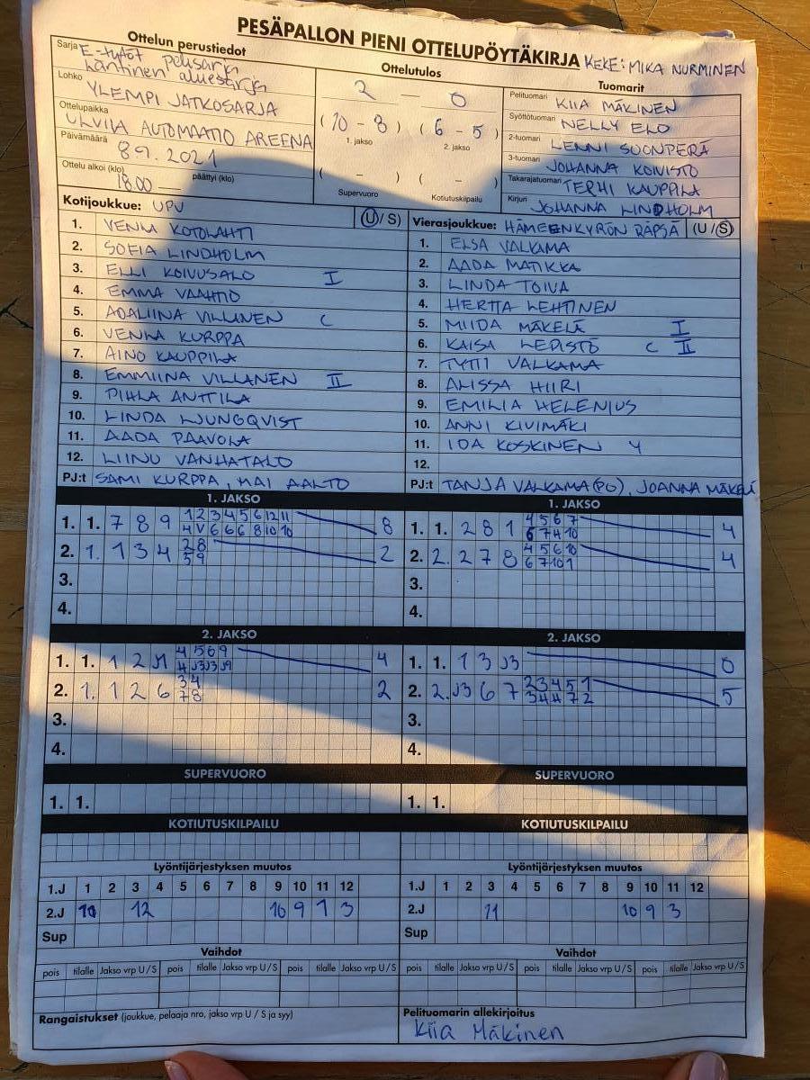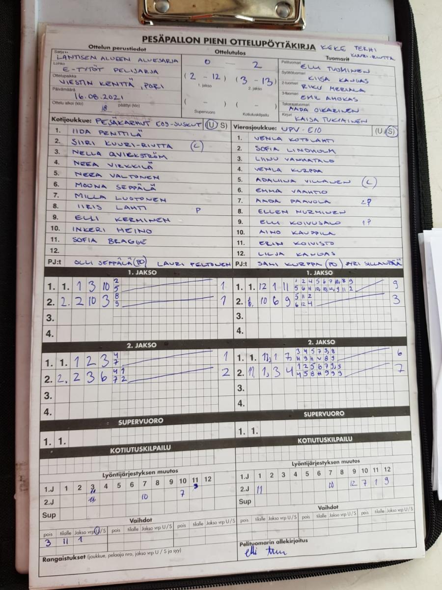 | 19.8.2021 18:00 | UPV E10-tytöt | MJ E oranssit | 2-1 (6-5, 3-8, 4-3) | näytä | |