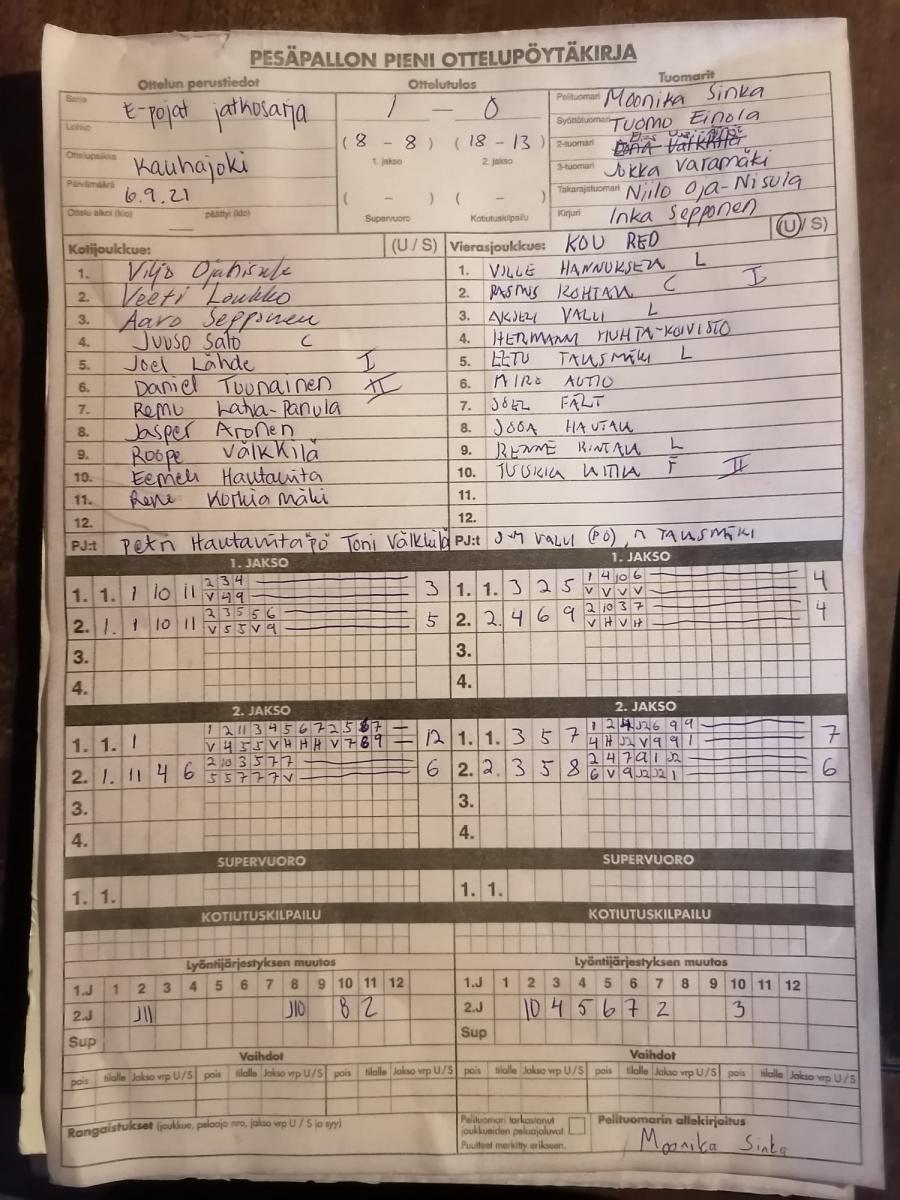 | 12.7.2021 18:00 | Kaka | SMJ E10 musta | 2-0 (10-9, 16-9) | näytä | |