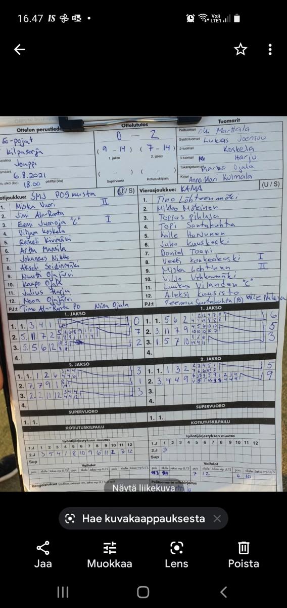 | 6.8.2021 18:00 | SMJ E09 musta | KaMa E10/11 -pojat | 0-2 (9-14, 7-14) | näytä | |