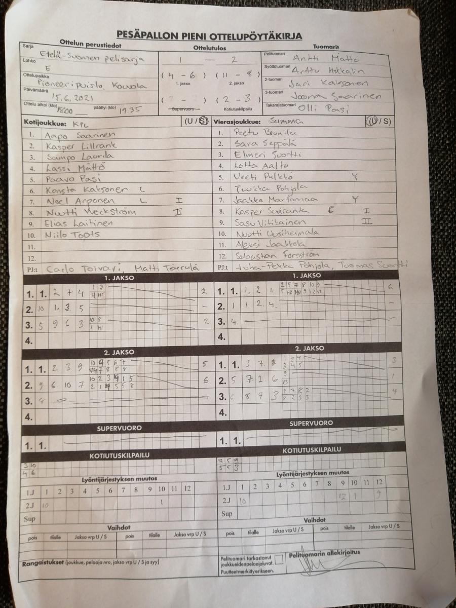 | 20.7.2021 00:00 | | SuPo E-Pojat | KPL E pojat | 1-2 (16-12, 0-6, 2-3) | näytä |