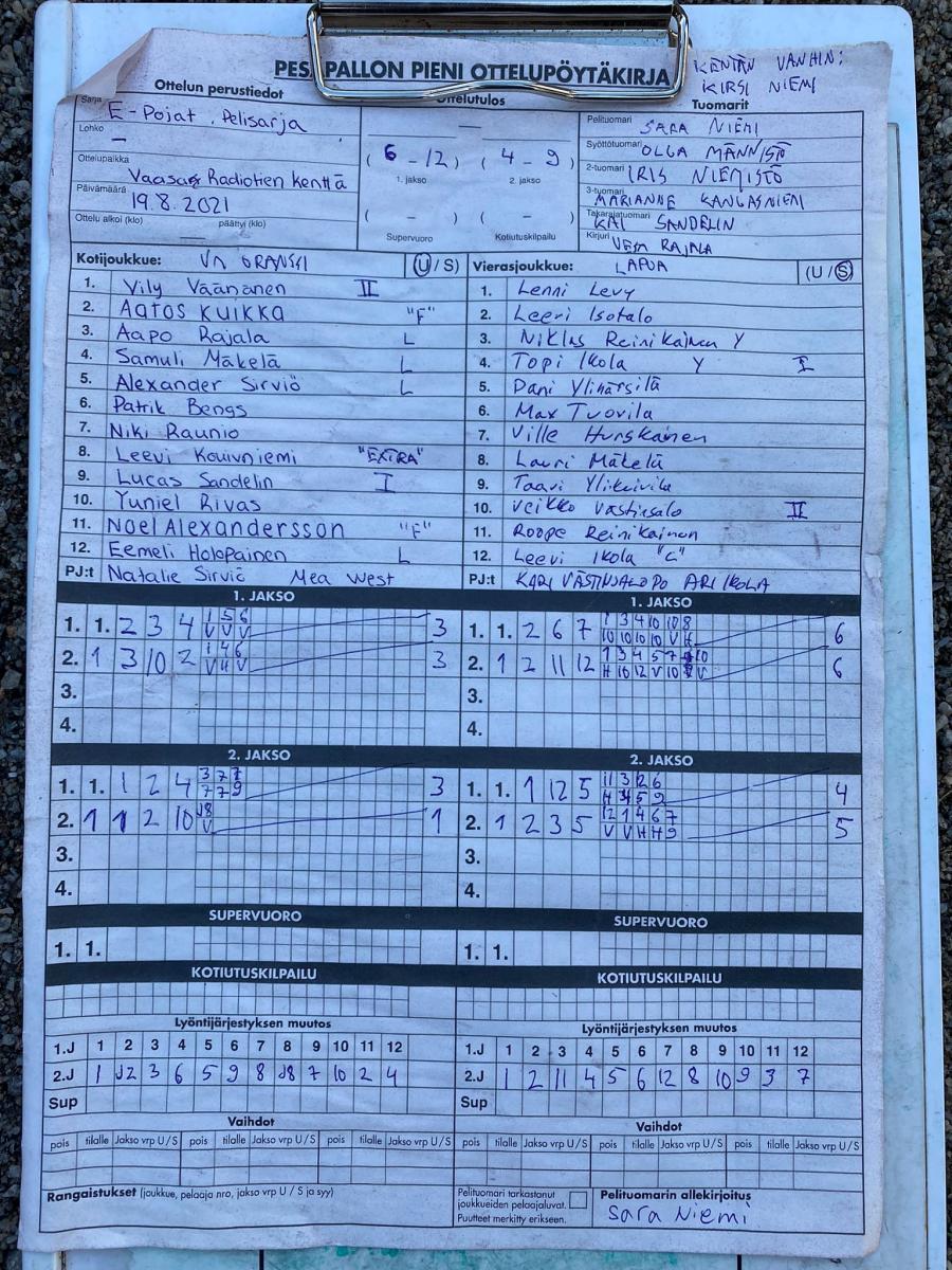 | 26.8.2021 18:00 | Virkiä | SMJ E10 punainen | 2-0 (16-7, 14-3) | näytä | |